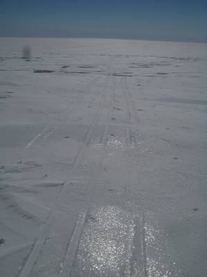 Olemme ihmetelleet sujuvaa matkan kulkua. Kuvittelimme, etteivät nuo kiviruuhet liiku viittä kilometriä päivässä ekoina viikkoina, mutta ihan muuta. Tämänkin päivän hiihto oli jo oikeaa vaellushiihtoa ja saldo erittäin tyydyttävä. Kuvassa näette, ettei ahkiot ja sukset liikoja uppoa tähän kivikovaan hankeen, mikä on varmasti osasyynä jouheaan menemiseen. Olemme oikein tyytyväisiä tilanteeseen ja toivomme samaa koko loppureissuksi. Epäilemättä toisin käy.