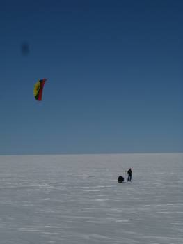 Päivä lähti käyntiin leijaharjoituksilla heti leiristä. Itätuulta oli 4 m/s ja pääsimme hienosti etenemään, vaikkakin hieman väärään suuntaan. Parin tunnin kuluttua tuuli tyyntyi täysin ja olimme 11 km päässä leiristä. Pääasiassa olimme ajautuneet länteen ja vain muutaman kilometrin pohjoiseen. Syynä oli vielä liian painavat ahkiot.