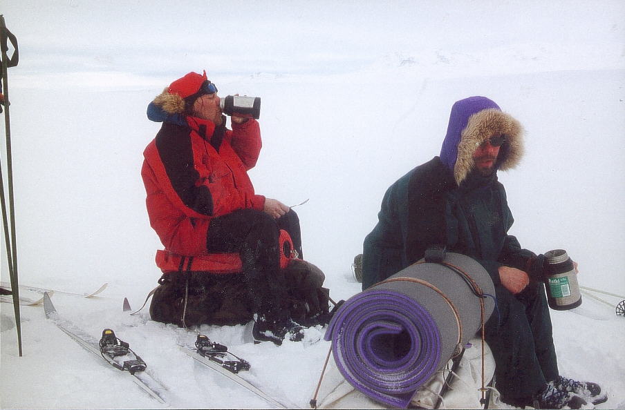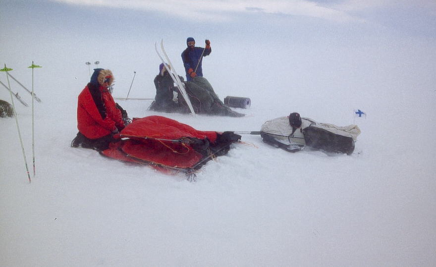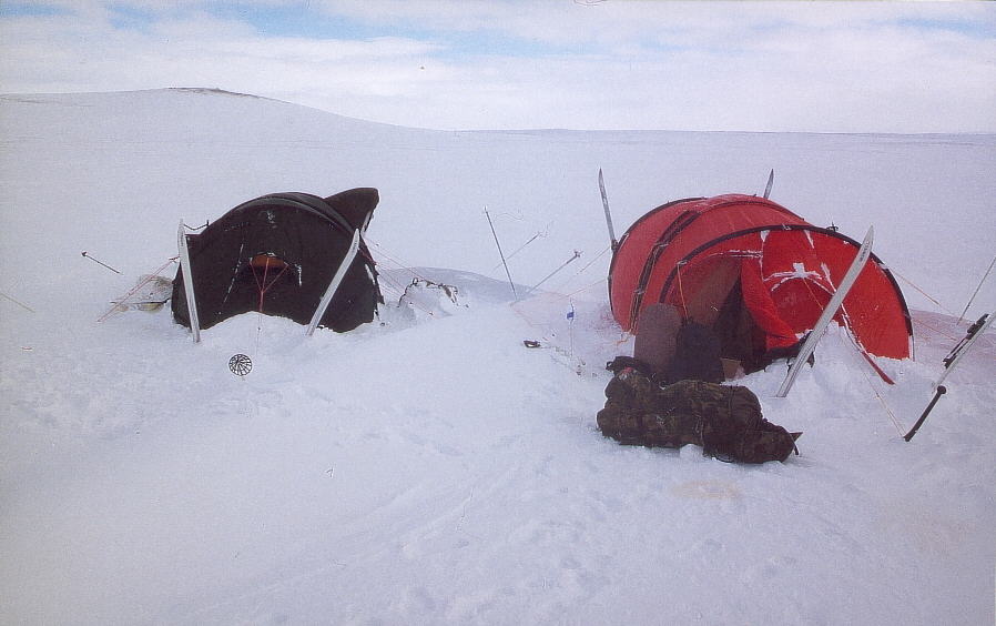 Sää vaihtelee todella nopeasti. Herätessämme oli täysin tyyni ja aurinkoinen keli. Sitten, juuri kun olin saanut makuupussini ulos kuivumaan, oli taas täysi rähinä päällä ja minulle tuli kiire sen takaisin hakemisessa. Seuraavaksi puurojen ja kahvin jälkeen, tullessamme ulos leiriä purkamaan oli jälleen aivan rantakelit, ja toiveet päivämatkan suhteen sen kun nousivat. Kuitenkin normaaliin tapaan heti ensimmäisen vedon jälkeen tuuli yltyi ja perinteinen harmaa seinä tuli vastaan. Lisäksi taivaalta, tai pilvestä missä kuljimme, alkoi ropista jäätävää tihkua ja pian kaikki olivat jääkuoren peitossa. Näkyvyys oli n. 50 metriä. Päivän kuluessa oli tunnin mittaisia vetoja, joiden aikana ei nähnyt mitään, mihin silmänsä olisi kohdistanut. Ja sitten tulivat mäet, joista ei kukaan voinut sanoa mistä ne alkavat tai loppuvat. Kompassisuunnan pitäen kiersimme ainoastaan ne ylämäet, joihin nenä ja suksenkärki osuivat samaan aikaan.