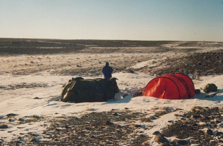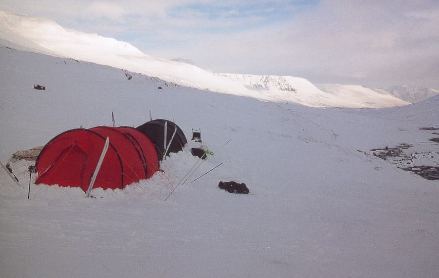 Iltapäivän puolella törmäsimme ensimmäiseen ihmiseen sitten Hveravellirin. Hän oli muuan Italialainen sooloilija matkalla etelärannikolle. Häneltä saimme kuulla vuonon heikosta lumitilanteesta. Hän oli tullut tänä aamuna taksilla Akureyristä 8,5 km:n päähän tästä paikasta erään maatilan pihaan. Ja siitä alaspäin lunta löytyi kuulemma perin kehnosti. Kertaheitolla meidät oli tänään repäisty ylängöltä tänne vehreään vuonon pohjukkaan ja saman tien joku Italialainen tuli ja sanoi matkaa olevan jäljellä vajaat 10 km. Vähemmästäkin perusmies innostuu ja pari kilometriä kuljettuamme laitoimmekin eväiden tuhoamisleirin pystyyn. Ei ollut enää puutetta mistään, ja kahviakin tarjoiltiin vallan teltasta toiseen. Sepe ilmoitti jo hyvissä ajoin iltasella, että aamupuurot on sitten tämän retken osalta nautittu. Monikaan ei ollut vielä ehtinyt ajatella tätäkään ihanaa asiaa. Näin ne kaupunkitavat pikkuhiljaa jälleen tulevat esille.