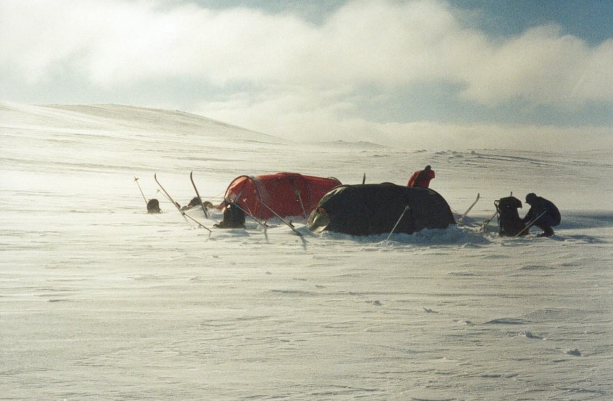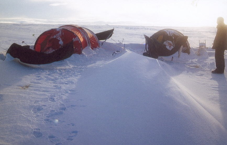 Jo hetken kuluttua, toisella vedolla, olimme jälleen täydessä myrskyssä. Taivaanrannasta tuli vastaan harmaa seinä, joka imaisi meidät sisäänsä ennen kuin huomasimmekaan. Näkökenttä katosi tyystin, kun myrsky tuli päällemme suoraan vastaisena. Viidennellä vedolla kuljetin porukan epähuomiossa sivutuuleen ja kulkeminen kävi niin epävakaaksi, että päätimme leiriytyä. Jälleen jouduimme hetken hakemaan paikkaa, jossa oli riittävästi lunta telttojen kiinnityksiin.