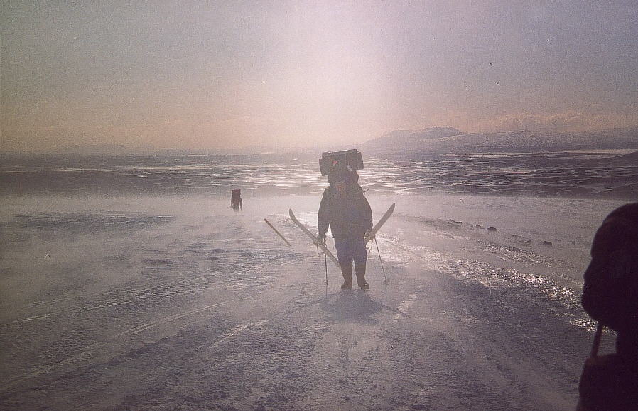 Ensimmäisen vedon nautimme kivikovasta hangesta ja luistavista suksista. Sitten se taas alkoi. Samalla tavalla kuin tulevinakin päivinä. Ensiksi tulee kevyt tuulenhenkäys vasten kasvoja ja sitten horisontti katoaa ja ilma on sakeanaan lumipölyä. Aurinko kuitenkin paistoi ohuen pilviverhon läpi ja me jatkoimme hiihtoa tienpohjaa seuraillen.
