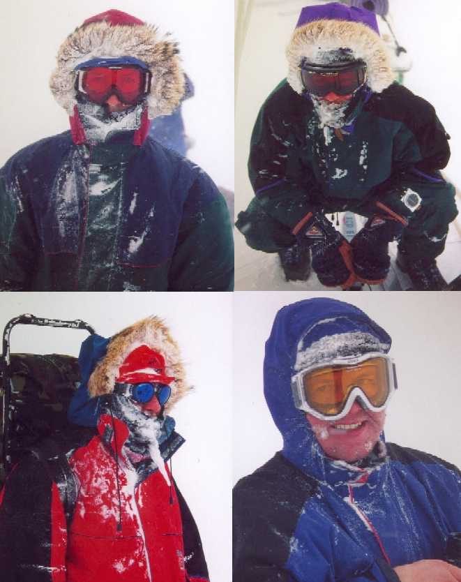 Tänään Sepe ja OP viihtyivät rinkat selässä koko päivän. Tauoilla, joita minä ja Vuorenmaa kuitenkin vaadimme he vain käänsivät rinkan kohti myrskyä ja tuulensuoja oli valmis. Eräällä tauolla sitten katselin kun Vuorenmaa nyppi jäätä parran ja viiksien seudulta ja sivistynyt mies kun olen, niin huomautin huutamalla vielä muutamasta jääpaakusta poskipään paikkeilla. Hetken hapuiltuaan hän paikallisti jäänpalasen ja nyppäisi sen pois, mutta kas kummaa. Miehellä lähti jään mukana palanen poskea irti. Tämän jälkeen päätettiin, että jäitä ei enää nypitä vaan jätetään maskiksi paikoilleen. Lopputuloksena oli OP:lla posket ja leuka paleltuneena ja muilla lievempiä oireita. Sepe taas kasvatti leukansa alle reilun 20 senttisen jääparran. Kylläkin komean sellaisen.