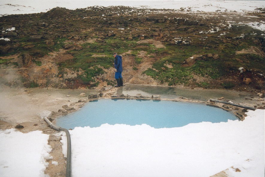 Illansuussa tulimme Hveravellirin isännän talolle ja tämä, 4000 Ikr:n (n.320 mk) korvausta vastaan ohjasi meidät vuokratuvalle ja esitteli paikat. Keskuslämmitys ja kuumavesihana, joihin kuuma vesi juoksee läheisestä lähteestä ympäri vuoden. Ulkona lämmitetty wc, jossa posliinipytty toimivine vesineen. Kun vessan veti kaksi kertaa ennen istumista, niin sai lämmitetyn istuinrenkaan. Lopuksi isäntä esitteli vielä laavalla vuoratun uima-altaan, jonka lämpötilaa sai säädellä altaan reunalla olevalla letkulla, josta juoksi jatkuvasti + 90 asteista vettä suoraan maan uumenista.